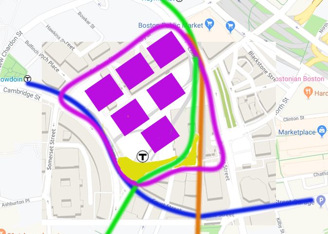 I love all of your suggestions for ways to break up Government Center into parcels. Given the complexity of building over the Brattle Loop, and considering that tight turnarounds like that and (ex-)Lechmere constrain the type of LRV able to be used, I think Brattle is an acceptable/inevitable jettison, made up for by adjusting service levels (necessary in light of the GLX anyway). I had sketched an idea out for realigning the Green Line tunnel previously in Paint, mainly to show that if you got rid of those and the fountain you suddenly have quite a lot of solid ground to work with: