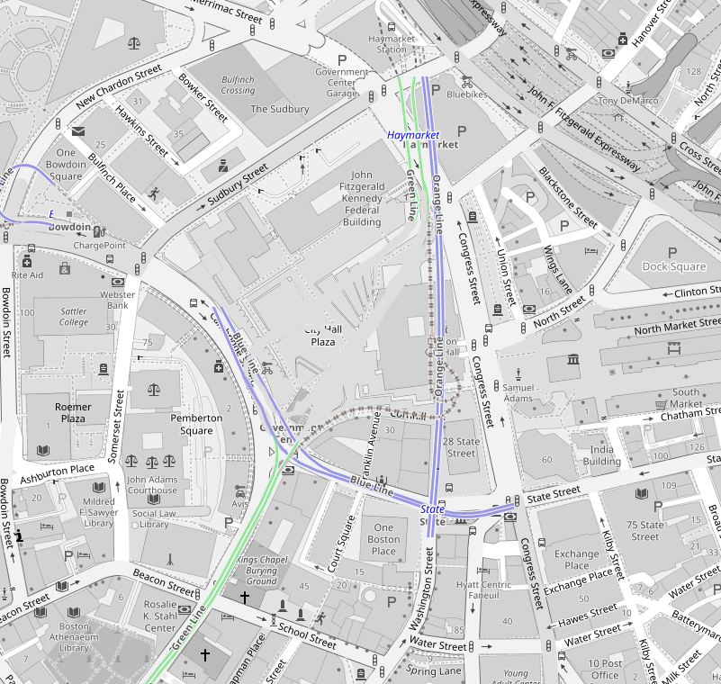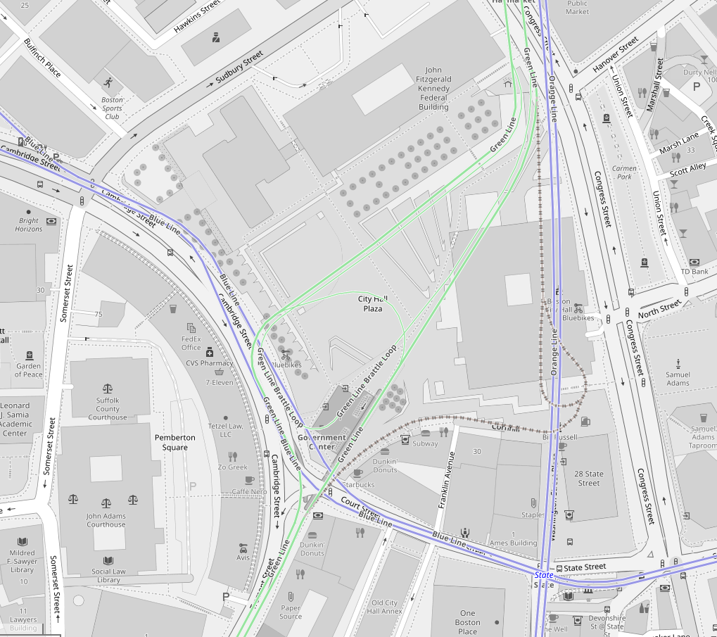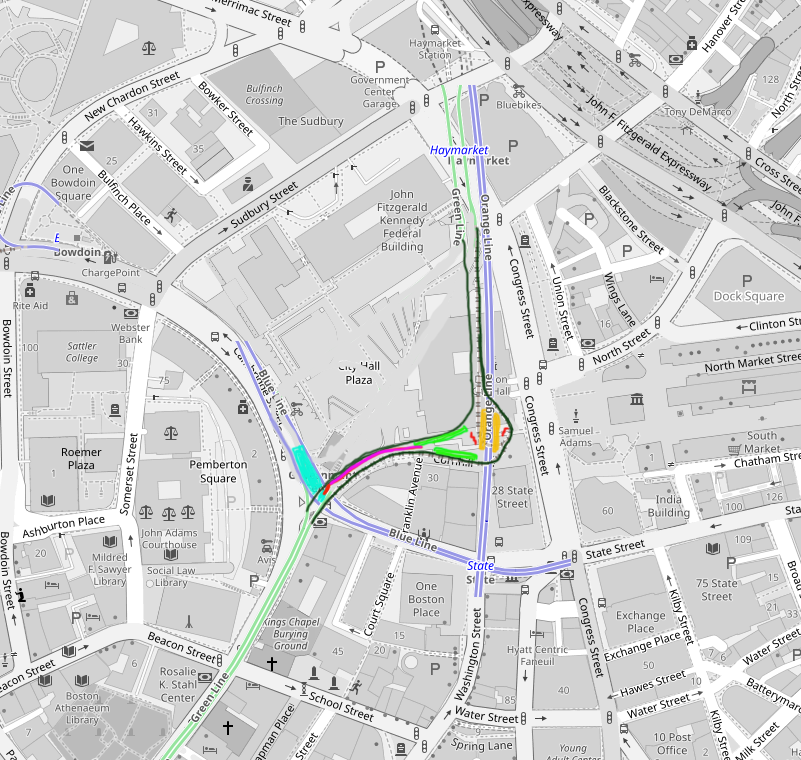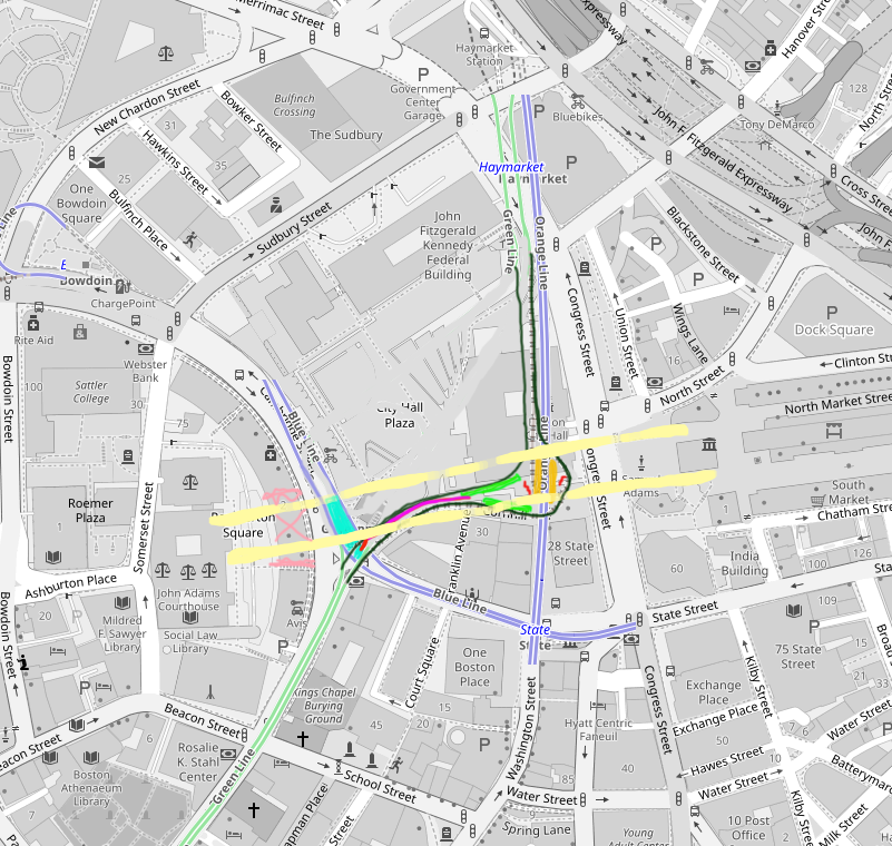 OpenRailwayMap, I wanted to go one step further. This is partially Crazy Transit, but I think fits well into a discussion of how to redevelop Gov't Center. Here are the Plaza tunnels as they currently exist, and then with demolition of the active GL tunnels:
