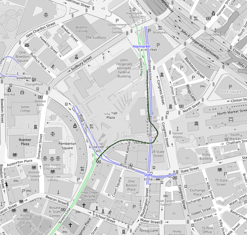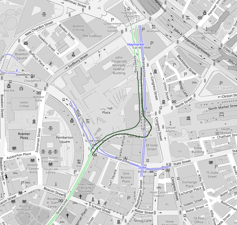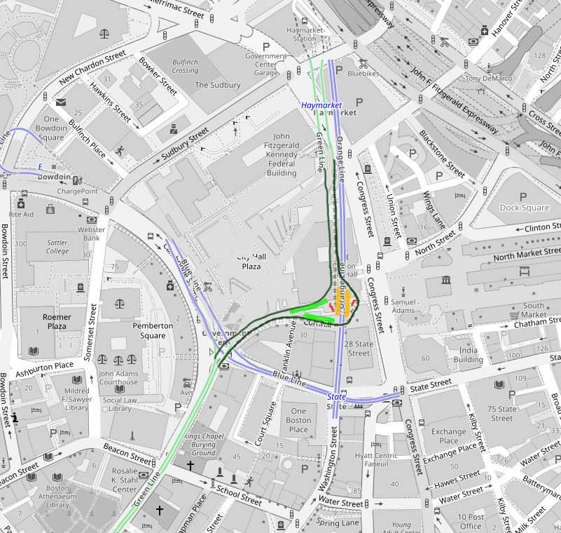 To tie into the existing BL platforms, you could construct a pedestrian walkway as part of the new Southbound GL tunnel that descends to the BL grade. Conceptually, I also really love the idea of opening up a sightline from the courthouse to Faneuil Hall via this corridor, which means opening up a part of Center Plaza as outlined. You could design the headhouse for this realigned station to have stunning sightlines of emerging from the ground to see one to the West and the other to the East: