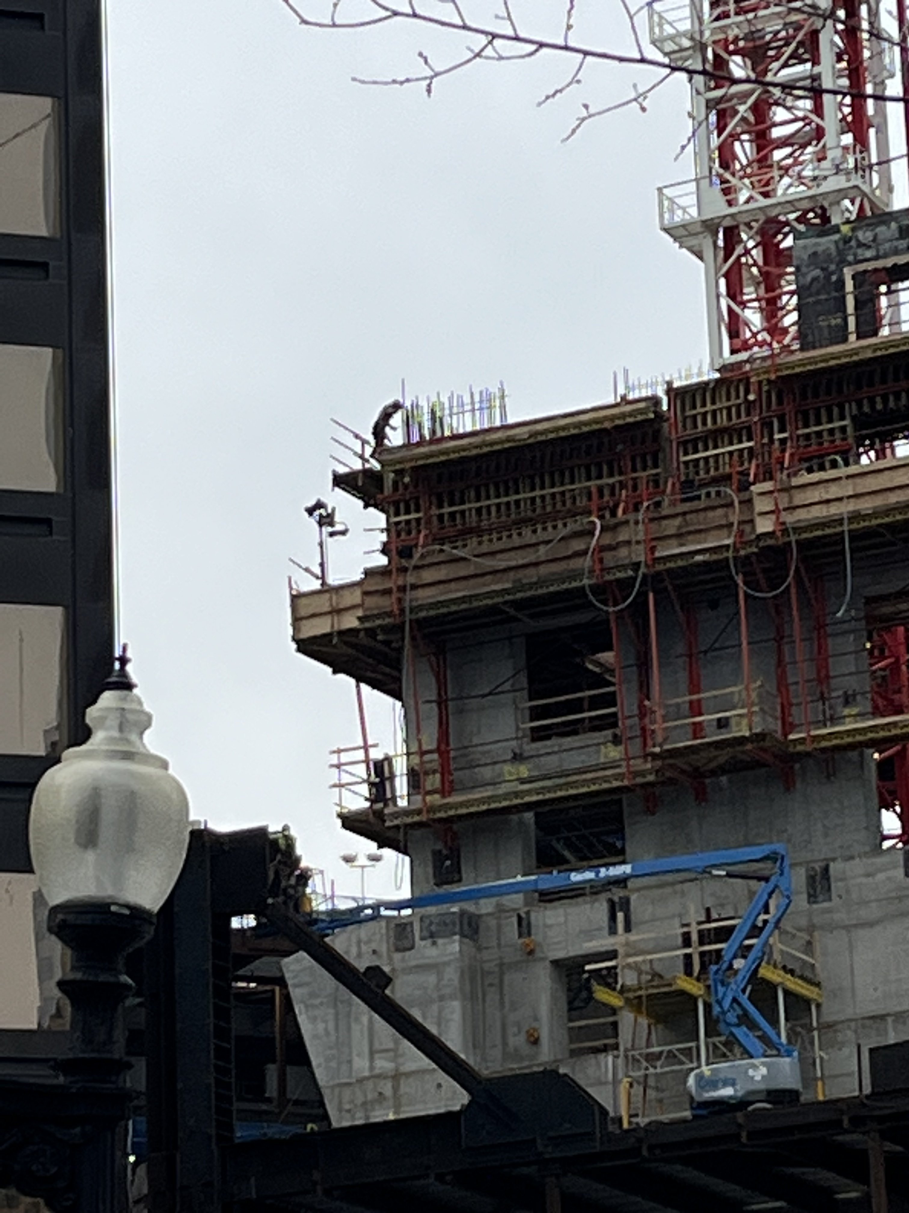 Saw that todayThe main crane is expanding upwards as of this afternoon; core is closing in on the turntable of the smaller crane (northeast of the core).